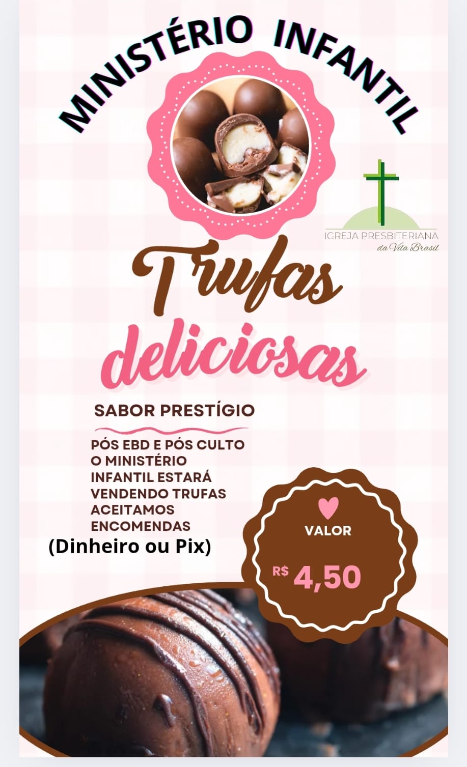 Departamento Infantil – Para continuar a arrecadação para o dia das crianças, nosso ministério estará vendendo deliciosas trufas neste domingo dia 05/10 após a EBD e pós culto!